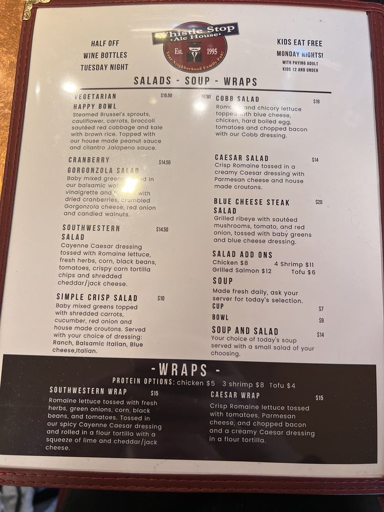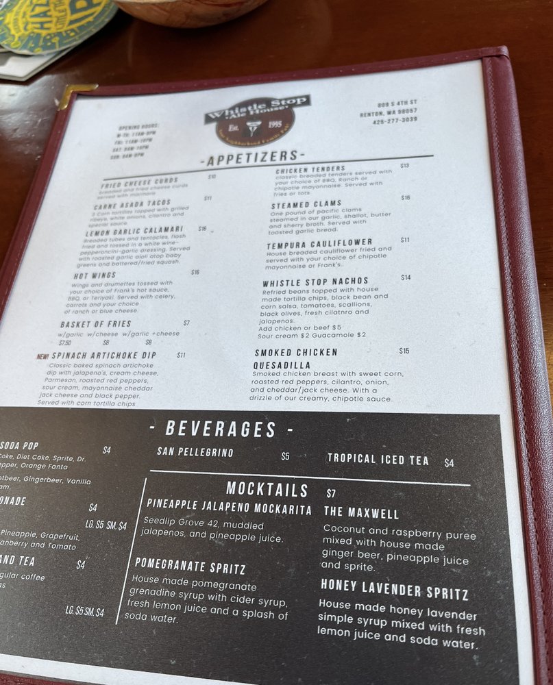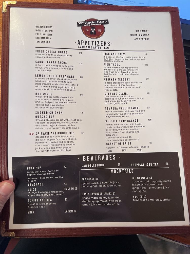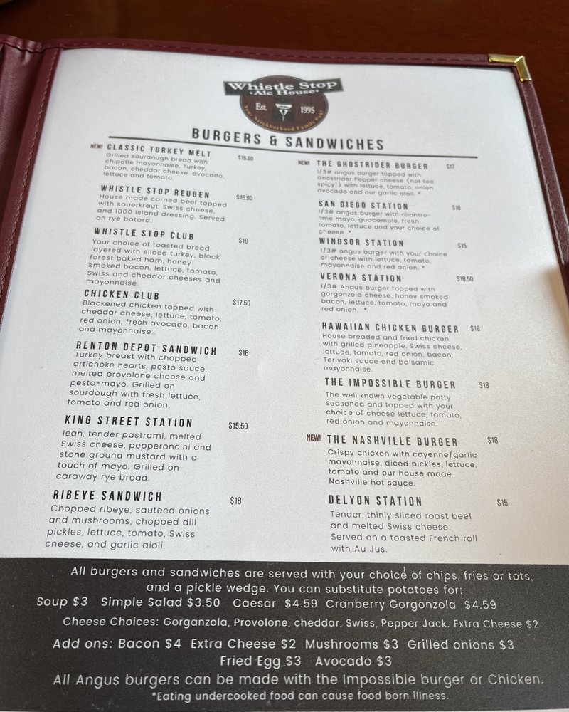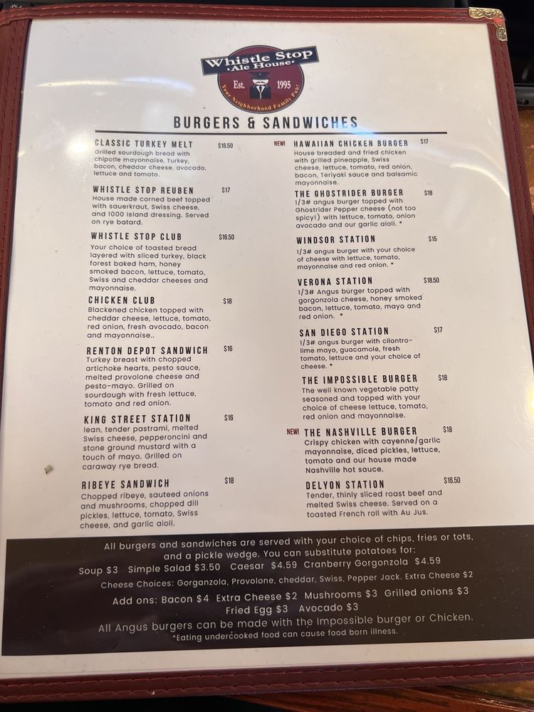 Whistle Stop Ale House, located in Renton, WA, is a vibrant pub offering an array of deli-style sandwiches, salads, and tasty burgers. The menu features the Whistle Stop Club Sandwich with layers of turkey, ham, bacon, cheeses, and mayo, the Grand Central Station Sandwich, and the Windsor Station Burger with natural beef and various toppings. Customers rave about the friendly service and the cozy atmosphere, making it a must-visit for lunch or dinner. The seasonal beer selection and delicious Nashville Hot sandwich have received high praise, with tater tots being a favorite side. Whether you're looking for a casual meal or a spot to catch up with friends, Whistle Stop Ale House delivers quality food in a fun environment. Don't miss their happy hour specials and outdoor seating options for a memorable dining experience.
